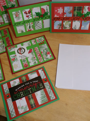 Handmade. Each card is unique. Green and red cards with coordinating Christmas-themed papers and decorations on the front. Blank on the inside, perfect for adding your own sentiment. Each card comes with a coordinating envelope.