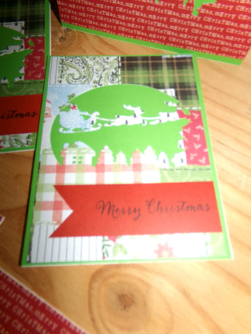 8 horizontal cards with red backgrounds, Santa with reindeer cutout, & "Merry Christmas" on the front. 4 vertical cards with plaid backgrounds, Santa with reindeer cutout, and "Merry Christmas" on foam on the front. Black on the inside, perfect for adding your own sentiment. Each card comes with a coordinating envelope.