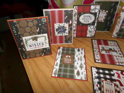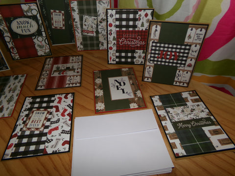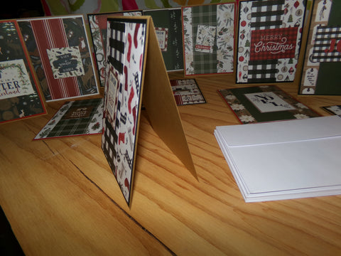 Each card is unique. Brown with red, black and white accents. Winter Wonderland paper on the fronts. Blank on the inside, perfect for adding your own sentiment. Each card comes with a coordinating envelope.